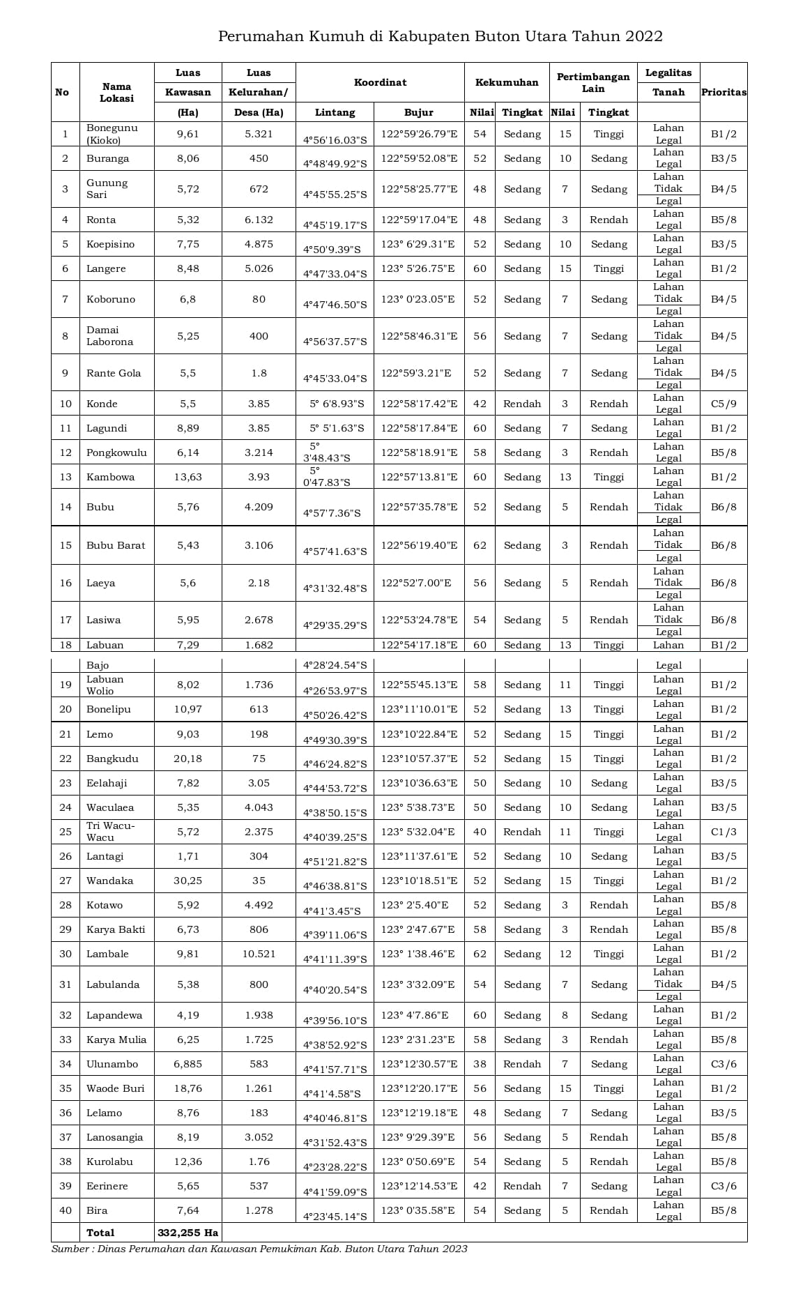 • Fungsi – fungsi rumah yang bercampur tidak jelas. Perumahan kumuh dapat ditemui di berbagai kota besar di dunia termasuk di Kabupaten Buton Utara. Perumahan kumuh di Butur tersebar dibeberapa kawasan yaitu di Kecamatan Kulisusu, Kecamatan Kulisusu Utara, Kecamatan Kulisusu Barat, Kecamatan Bonegunu, Kecamatan Kambowa dan Kecamatan Wakorumba Utara,”namun, perumahan kumuh di Kabupaten Buton Utara belum di tetapkan dalam Surat Keputusan Kepala Daerah tentang Kawasan Kumuh. Surat Keputusan Kepala Daerah tentang Kawasan Kumuh masih dalam tahap verifikasi tetapi data perumahan kumuh yang akan menjadi lampiran pada SK Kawasan Kumuh tersebut sudah tersedia,”. (M2)