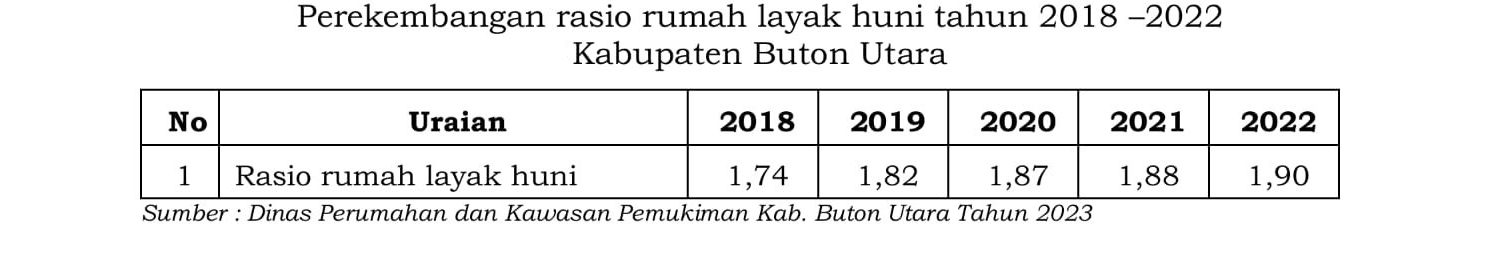 Tahun 2022, rumah layak huni yang ditargetkan 72,30% ( 100 unit) per tahun, namun pada tahun tersebut rumah layak huni realisasi mencapai 72,27% (96 unit) dengan persentase capaian ini sebesar 99,96 %. Jumlah rumah layak huni di Kabupaten Buton Utara adalah 10.255 unit pada tahun 2022 jumlah rumah layak huni bertambah 96 unit. Capaian ketersediaan rumah tidak layak huni mempengaruhi rasio rumah layak huni di Kabupaten Buton Utara.
