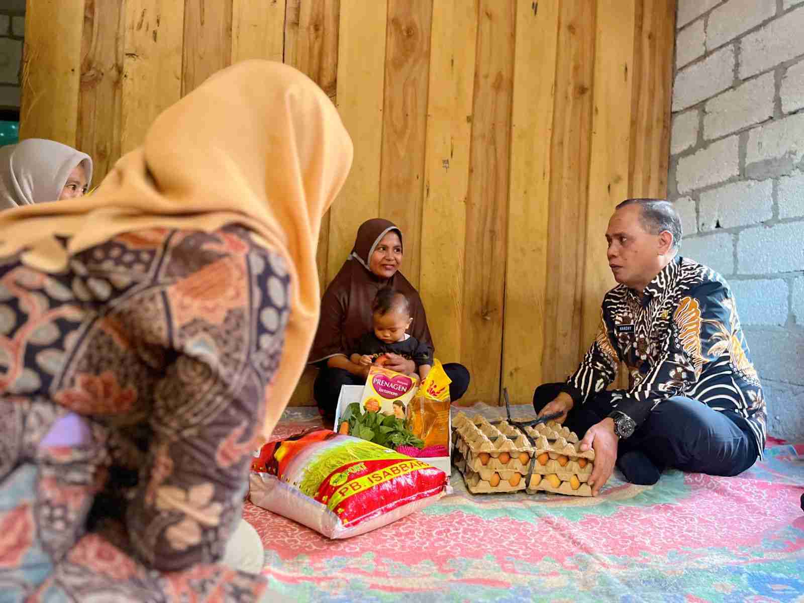 Sekretaris Daerah Buton Utara Muhammad Hardhy Muslim menyerahkan bantuan paket manfaat program BIAAS kepada keluarga penerima manfaat untuk Balita dua tahun beresiko stunting di Desa Damapala Jaya, Kecamatan Kulisusu Barat. (Foto : ist)