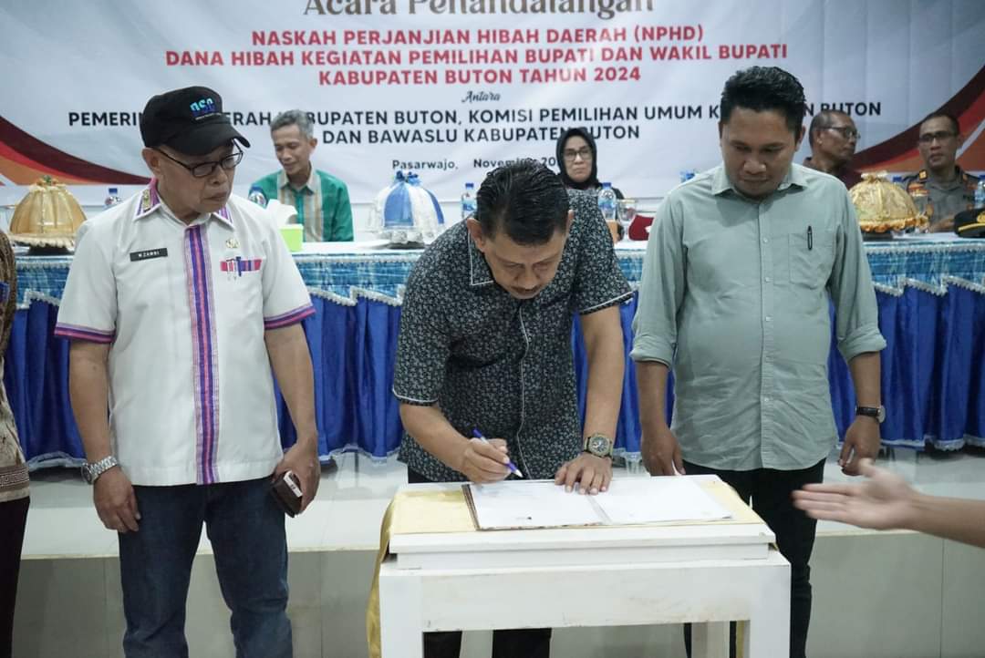 Buton, Jurnalsultra.id – Penjabat (Pj) Bupati Buton, La Ode Mustari menandatangani Naskah Perjanjian Hibah Daerah (NPHD) dengan Komisi Pemilihan Umum (KPU) dan Badan Pengawas Pemilu (Bawaslu) Buton, di Aula Rumah Jabatan (Rujab) Bupati, Jum’at, 3 November 2023.